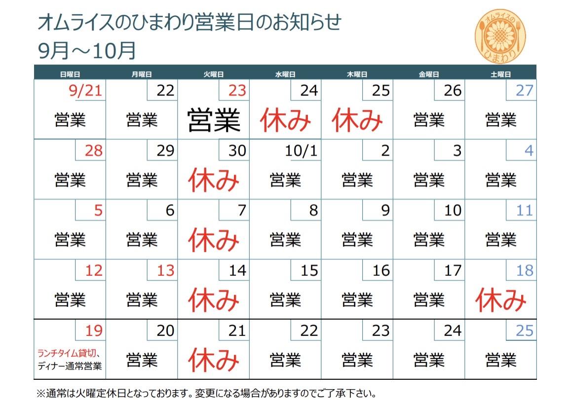 今日はひまわりの 9月10月は臨時営業や臨時休業、貸切のお知らせです。